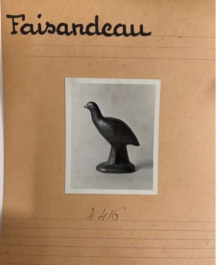 Ce Faisandeau daté 1957 est réalisé dans l’atelier de sculpture de la Manufacture Nationale de Sèvres à titre personnel et après autorisation, c’est un grès émaillé brun noir façon bronze et répertorié (rep1), ceux réalisés et édités en plusieurs exemplaires sont en grès rouge non émaillé (rep2).