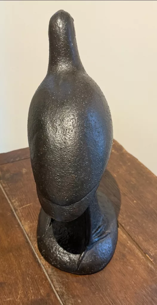 On remarque l’esthétisme des formes, la surface grumelée de l’émail apporte de l’ampleur et de la beauté à notre pièce. Notre oiseau dont on remarque les grandes pattes est installé sur une sorte de promontoire se terminant par un socle. Derny utilise des lignes simples et pures sans artifice, pas de représentation du plumage, qui confèrent à l’ensemble beaucoup de poésie et de contemplation.