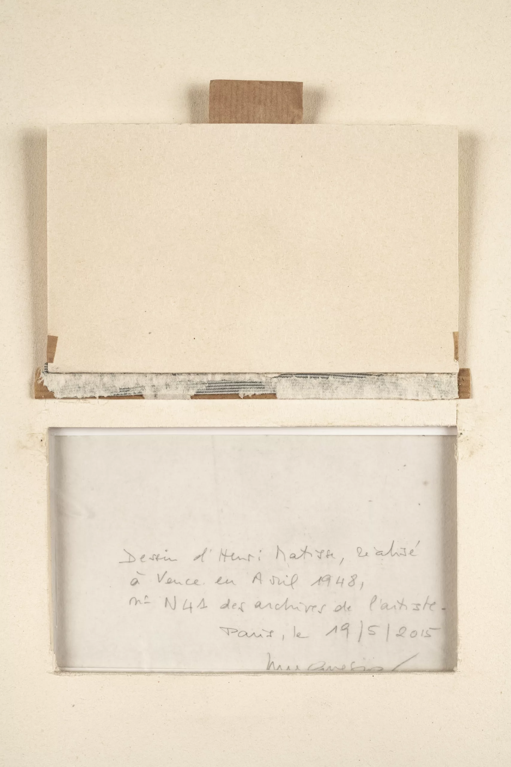Confirmation écrite du numéro d’archive Matisse (n° 41)  par Madame Wanda De Guébriant au dos de l’œuvre en date du 19 mai 2015 suite à la perte par les anciens propriétaires du certificat original Accompagné d’un passeport de libre circulation du 26/10/2016